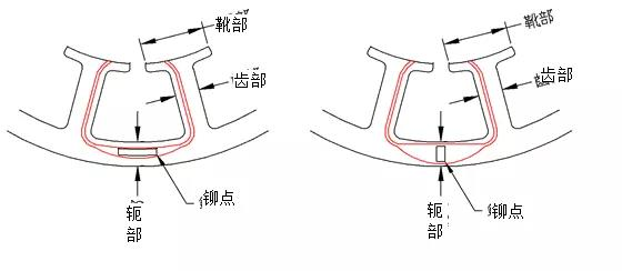 軛部:設(shè)計(jì)有三項(xiàng)需注意,分別為磁通密度、機(jī)械強(qiáng)度及鉚合點(diǎn)問題,先由簡(jiǎn)單的鉚點(diǎn)設(shè)計(jì)來(lái)說(shuō),基本上要先考量矽鋼片堆疊后的重量來(lái)決定鉚點(diǎn)數(shù)量,過(guò)多的鉚點(diǎn)數(shù)會(huì)影響磁力通過(guò)及機(jī)械強(qiáng)度問題,合理的鉚合強(qiáng)度,鉚點(diǎn)數(shù)越少越好。下圖表示鉚點(diǎn)的方向好與磁通方向一致,降低對(duì)磁通影響程度。