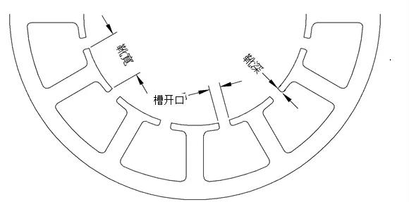 槽開口尺寸決定后,槽寬就為已知,再加上齒部寬度尺寸與齒部矽鋼片磁通密度設(shè)計(jì)值,則可計(jì)算槽深尺寸。一般常見之矽鋼片磁通密度設(shè)計(jì)值為1.6T(特斯拉:表示單位面積流經(jīng)的磁力),而空氣的磁通密度為0.6T,其中差了2.67倍;則槽寬減去齒寬后,再除上2,以獲得單側(cè)尺寸,后面再除上空氣與矽鋼片的磁通密度比例差2.67,即可得到蕞小槽深尺寸,若于靴部與齒部銜接處,加入導(dǎo)角或斜角設(shè)計(jì),小槽深尺寸可以進(jìn)一步縮短空間。