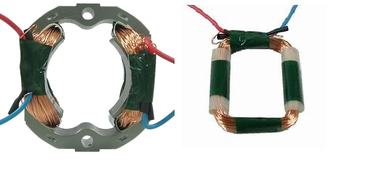 銅損亦為電氣損失的一種,系指電流通過導(dǎo)電材質(zhì)時(shí),因材質(zhì)阻抗所引起之電能傳輸損失,于電路學(xué)中稱為導(dǎo)通損失;其來源為電機(jī)線圈電阻,線圈實(shí)體如下邊所示。電機(jī)線圈一般采用具有較低阻抗值的銅作為導(dǎo)電材料,故電機(jī)導(dǎo)通損失皆直接稱為銅損。