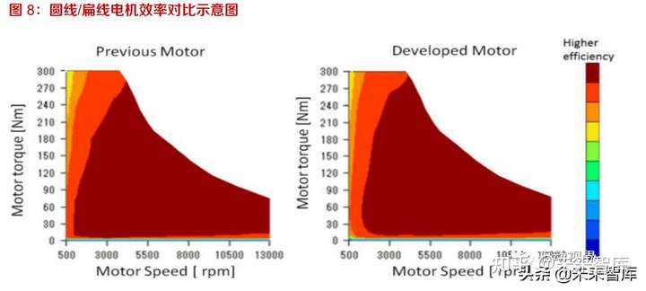 扁線具有較高的槽滿率,高能量轉(zhuǎn)換效率帶來電池成本節(jié)約。電機(jī)的功率與銅含量成正相關(guān),相 同體積下銅線填充量增加 20-30%,意味著輸出轉(zhuǎn)換功率有望提升 20-30%。扁線電機(jī)具有高槽滿 率,其純銅槽滿率達(dá)到 70%,而傳統(tǒng)圓線僅 40%左右;電機(jī)的能源損耗中 65%來自于銅耗,由 于扁線電機(jī)需要的銅線比相同功率的圓線電機(jī)更短,繞組電阻降低,銅耗降低,帶來了更高的轉(zhuǎn) 換效率。此外,在市區(qū)城市擁堵的工況(低轉(zhuǎn)速高扭矩)中,扁線電機(jī)工作效率要比圓線高出 10%。高槽滿率帶來更高的效率區(qū)域面積,車輛路況試驗(yàn) WLTP 續(xù)航增加,在續(xù)航里程相同的情況下 減少蓄電池容量,可有效降低整車成本 15%。